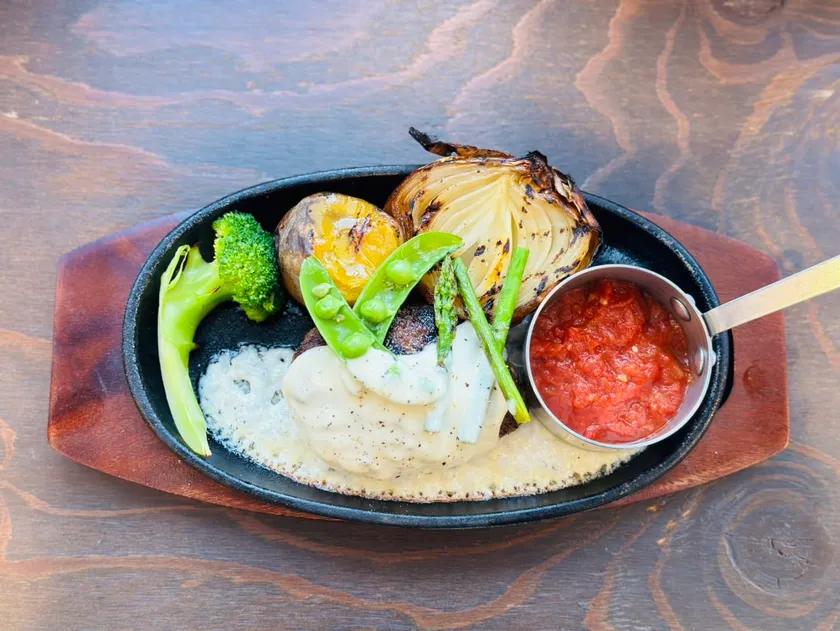 北海道産和牛100%使用した手ごねハンバーグに道産ラクレットチーズと特製トマトソースを合わせました。さっぱりフレッシュなトマトソースとハンバーグの相性は抜群です。お客様の目の前でおかけするチーズは鉄板の上で熱々に。スナップエンドウやアスパラガスで春使用に仕上がりました。