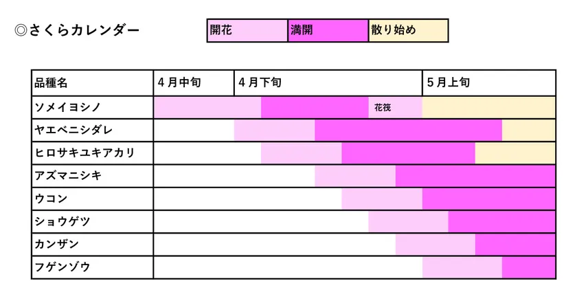弘前公園内にはソメイヨシノに続いて咲き始める桜が40品種約700本あり、その桜の中から厳選7品種の八重桜を『弘前七桜』と名付け、『さくらカレンダー』で見頃を紹介します。ソメイヨシノから始まる桜のリレーをお楽しみください。