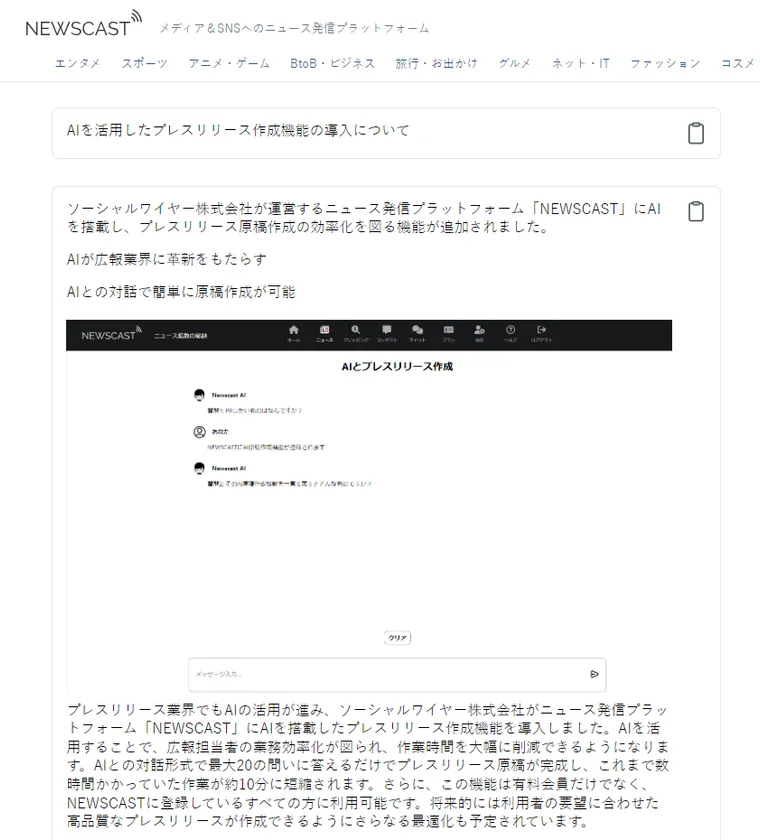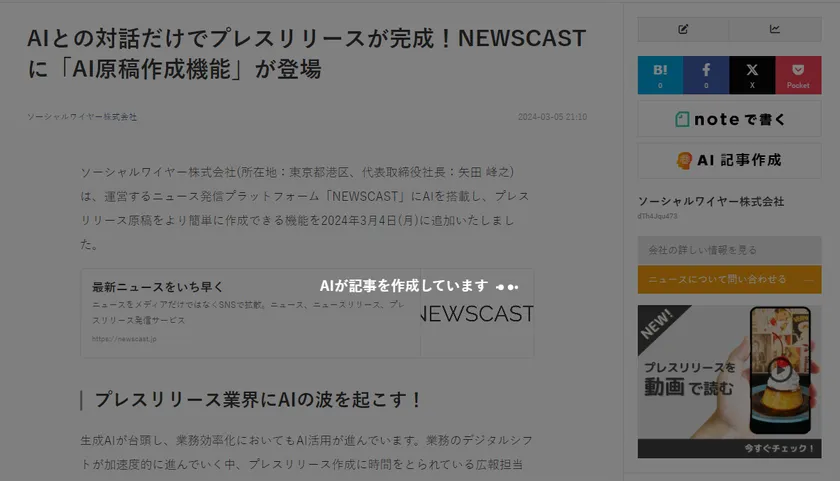 瞬時に記事生成!ニュース発信プラッフォーム NEWSCASTに 「AI記事作成」機能が登場 追加費用なしで利用可能