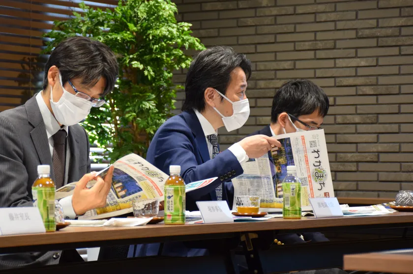 意見交換会でタウン誌『わがまち』の説明を受ける濱地副大臣(中央)(特別養護老人ホームユーカリゆうとの杜にて撮影)