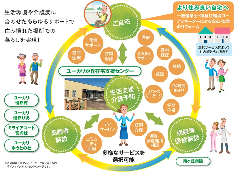 ユーカリが丘北部約15haの敷地に医療・福祉機能に加え多世代交流の場を設けたエリアのこと。単なる老人村とせず、野菜・果物の収穫など利用者の持てる可能性を発見し、自らの存在感と自信を取り戻せるよう援助しながら、楽しさや幸福感の方向へ気持ちの転換を図る「ダイバージョナルセラピー」を推進しています。また、今後は広域福祉の拠点として、医療機関の整備や在宅介護のベースとしての機能整備を図っていきます。