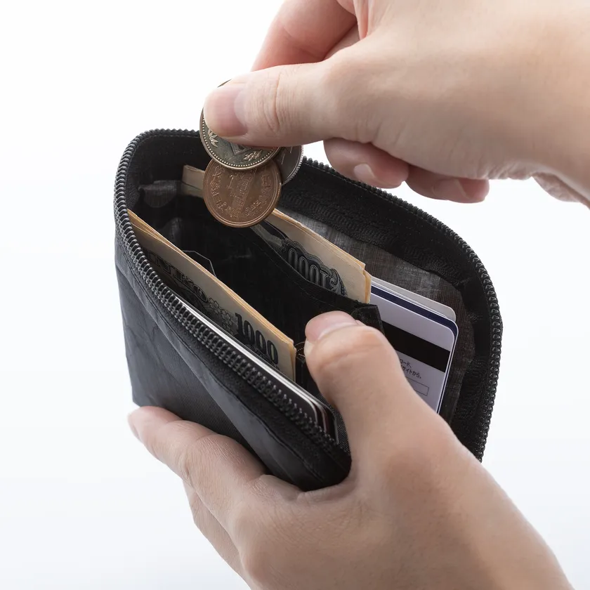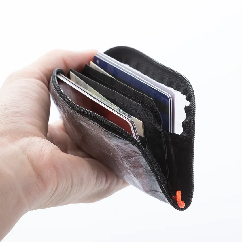 軽くコンパクトでありながら、最大で二つ折り紙幣20枚、コイン30枚のほか、15枚のカードを収納できます。強く軽く薄いDyneema(R) Composite Fabric Hybrid素材なので、ウォレット自体の厚みをほぼ感じません。入れるものが増えてもかさばらず、ポケットにスッと差し込めます。