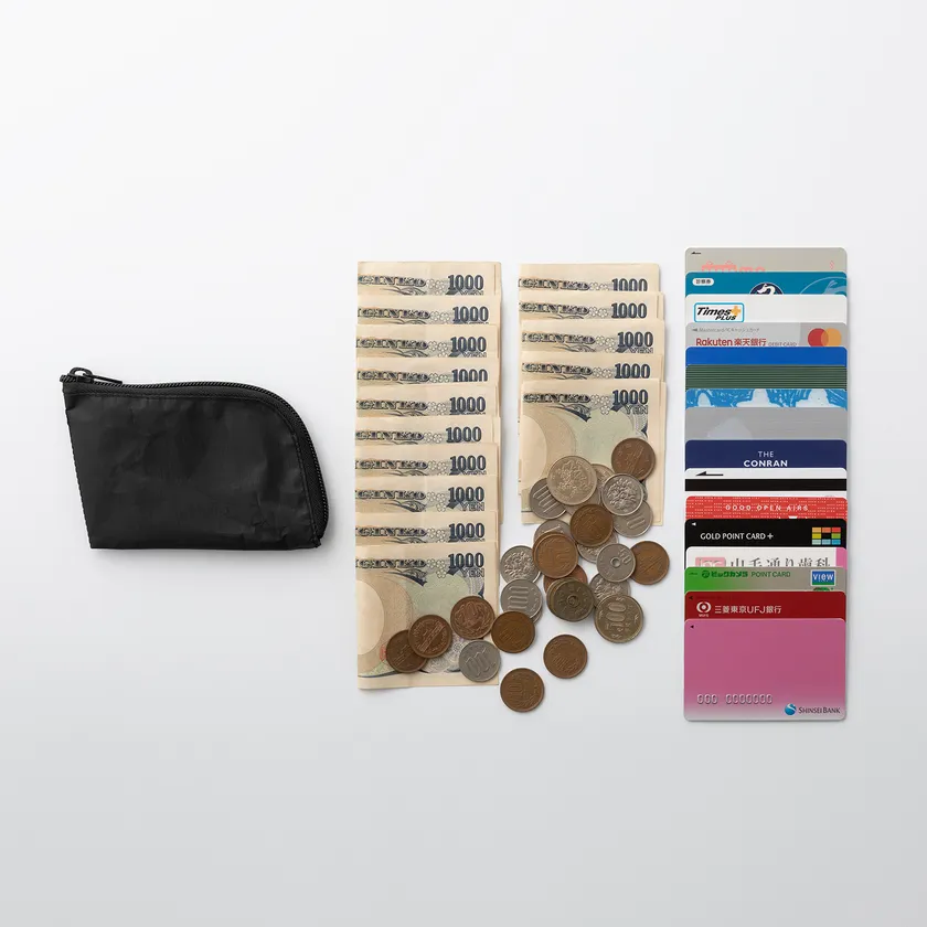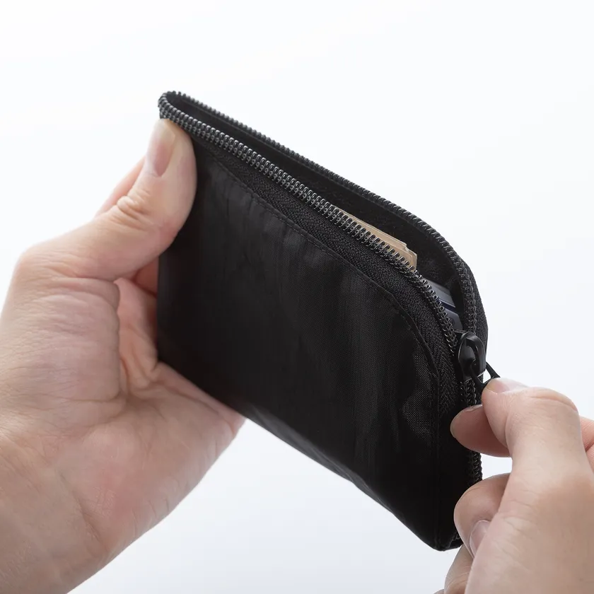 究極のわずか約8g。ウォレット自体の重さをほぼ感じない、空気のような軽さです。自転車、ランニング、登山など、装備の軽さが要求されるスポーツシーンで、いざという時に必要十分な現金やカード、家の鍵などをパフォーマンスの妨げにならずに携帯できます。最大で、四つ折り紙幣10枚、コイン20枚、カード6枚が収納できます。