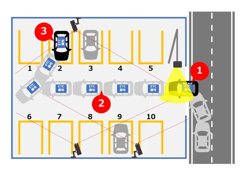 1. 駐車場に入場時、ETCアンテナでETC車載器の番号を取得。同時に、AIカメラでも入場車両を検知し、ETC車載器番号をAI画像にタグ付け。