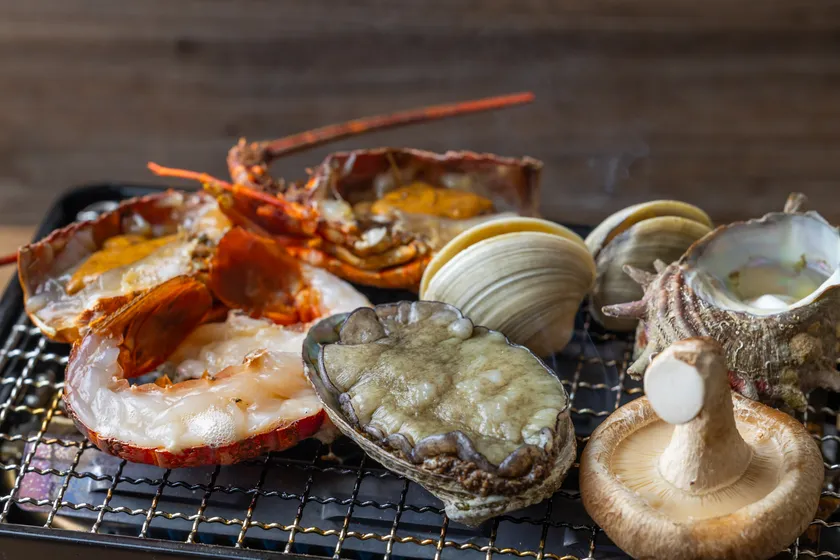 夜メニューは、平日および土日祝に関係なく、16:00~22:00(L.O.21:00)でご提供。まぐろや金目鯛などのうお焼きはもちろん、アワビや地サザエ、赤えび、白はまぐりといった数々の豪華海鮮も楽しめます。さらに刺身、海鮮丼に地元産の肉、野菜、近隣商店が販売するこだわりの逸品を使ったメニューまで、熱海グルメを思う存分堪能できます。