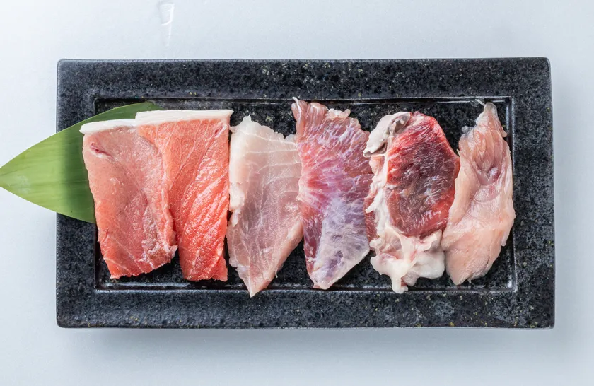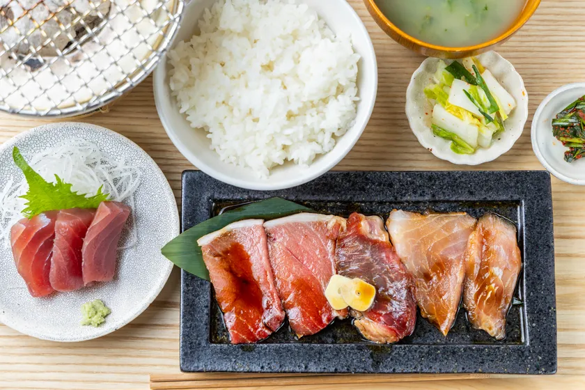 当店の看板メニュー「うお焼き」と刺身、羽釜炊きのご飯、味噌汁、新香などがついた定食メニュー。目の前で仕上げる〆の出汁付きで、最後まで海鮮を堪能いただけます。「まぐろカルビ」は、鮪のトロ・ほほ・目肉・赤身・頭肉など5種を日替わりで提供。「金目鯛堪能定食」は伊豆近海で獲れた金目鯛を使用。専用の七輪でサッと炙り、ふっくらご飯の上に薬味とのせれば、絶品「炙りめし」の完成!ぜひご賞味ください。