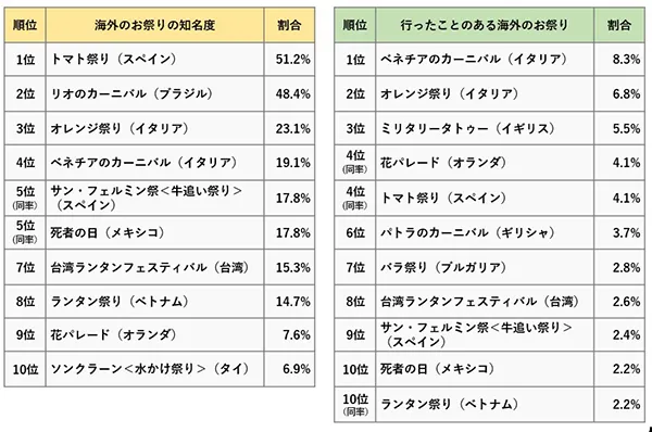 一方、海外のお祭りの知名度(どんなお祭りか何となくでも知っているものが対象)の結果を見ると、1位は「トマト祭り(スペイン)」(51.2%)、そして3位には「オレンジ祭り(イタリア)」(23.1%)が入っており、野菜や果物を投げ合うお祭りの知名度が高いことがわかります。