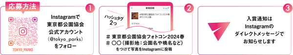 東京都公園協会の公式Instagramアカウント「tokyo_parks」をフォローし、指定のハッシュタグ「#東京都公園協会フォトコン2024春」、「#〇〇(撮影地の公園名や橋名など)」をつけて、都立公園・庭園、隅田川で撮影した写真を投稿するだけで簡単に応募ができます。何度でも応募できますのでたくさん撮ってぜひご応募ください。