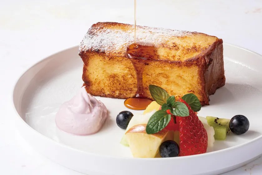 ホテルベーカリー ハニービー特製の「はちみつミルクパン」で作ったオリジナルフレンチトースト。ほんのり甘いパンを卵のアパレイユにじっくり浸ししっとりとした食感に仕上げました。