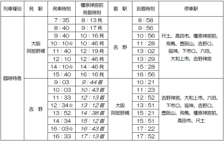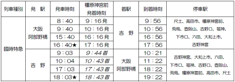 ★は、橿原神宮前~吉野間を延長運転します。