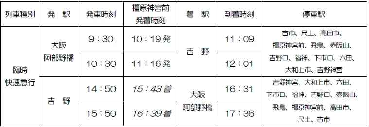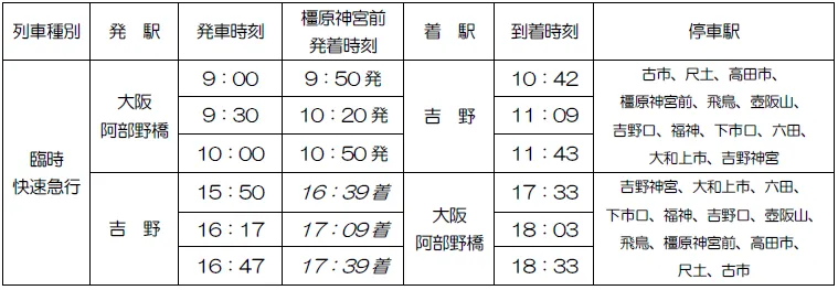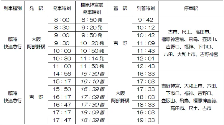 2.列車種別、発駅、発車・到着時刻、停車駅(※斜体 = 橿原神宮前駅の到着時刻)