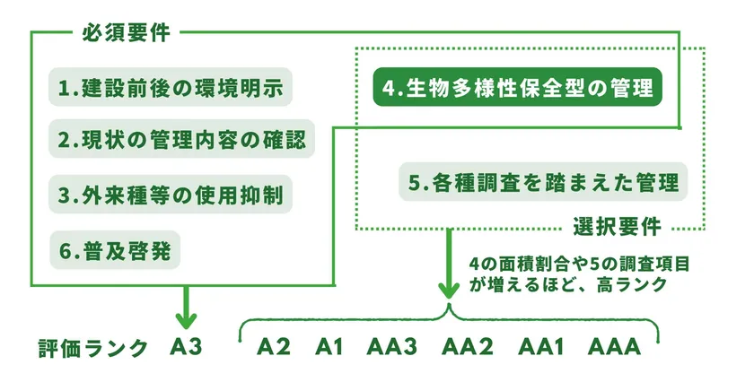 全敷地を対象として評価した結果、外来種等の使用抑制や、除草剤の不使用かつ生物多様性保全型の管理を全体の5%以上で行う等の要件を満たしており、評価ランクはA3となりました。
