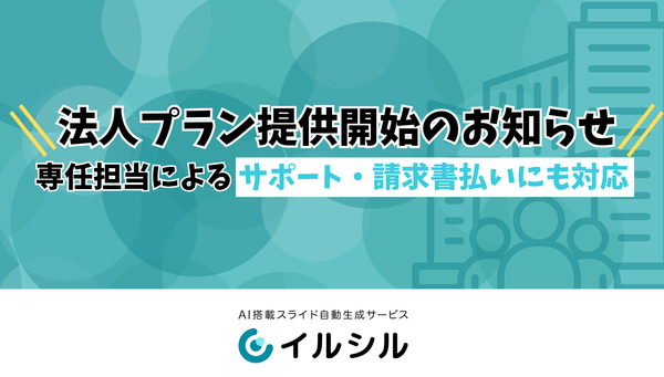 AI搭載スライド自動生成サービス「イルシル」を提供する株式会社イルシル(本社:東京都渋谷区、代表取締役:宮﨑有貴)は、法人ユーザーの多様なご利用ニーズにお応えするため、新たに「法人プラン」を2025年7月2日より提供開始いたしました。