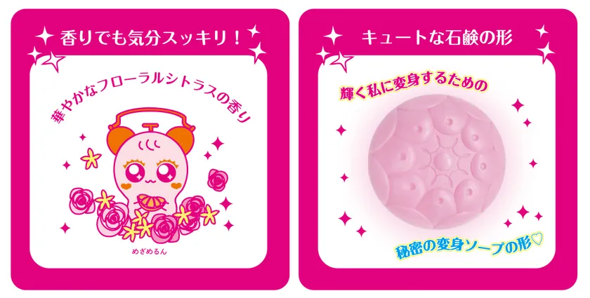 石鹸の形はこのために作成した、変身できちゃいそう!?なキラキラピンク色のオリジナルの変身ソープの形!「めざめるん」で輝く新生活を迎えましょう!
