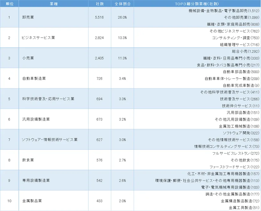 4位以降は、4位が自動車製造業(社数 726社、3.4%)、5位が科学技術普及・応用サービス業(社数 694社、3.3%)、6位が汎用設備製造業(社数 673社、3.2%)、7位がソフトウェア・情報技術サービス業(社数 627社、3.0%)、8位が飲食業(同576社、2.7%)、9位が専用設備製造業(同542社、2.6%)、10位が金属製品業(433社、2.0%)となっています。4位~10位の7業種の中で、製造業から4業種がランクインしていますが、全体に占める割合は1割程度で製造業の日系企業は少数といえます。