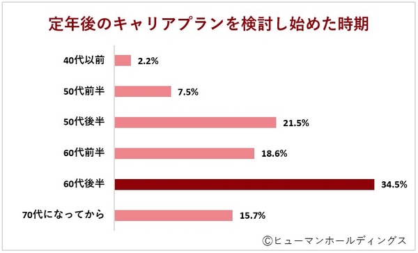 ●定年後のキャリアプランを持っている41.4%のうち、キャリアプランを検討し始めたのは「60代後半」が34.5%と最多。次いで「50代後半」が21.5%で、定年退職前から定年後のキャリアプランを検討していた層も多い