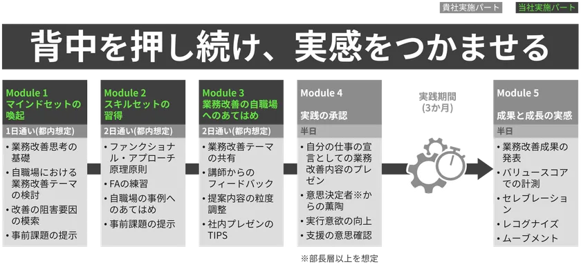 そこで、当社はプログラムコンセプトを「背中を押し続け、実感をつかませる」と設定しました。自身の仕事の改善点を考え提案し、最後までやりきる過程をすべて後押しするのです。