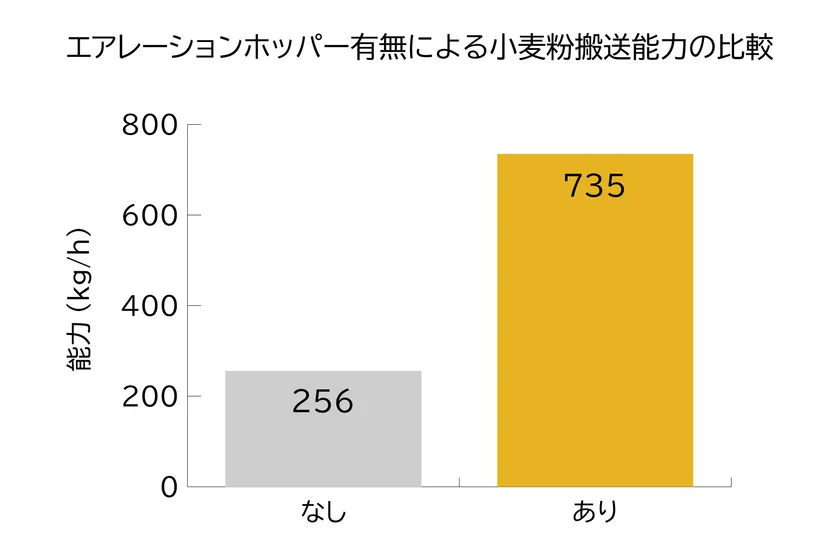 エアレーションホッパーを使用することで、小麦粉の平均搬送能力(kg/h)は2.87倍になりました。通常に比べ、短時間で大量に次工程への小麦粉供給が可能です。