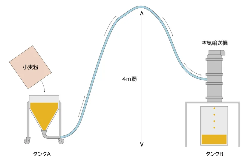 空気輸送機を用いて小麦粉をタンクA(画像左)からタンクB(画像右)へ搬送します。小麦粉の供給元であるタンクAにエアレーションホッパーを設置し、タンクBにて小麦粉の搬送量を計量。