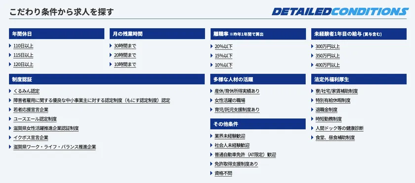 求職者の求人探しをサポートするため、一般的な給与や職種での検索の他に『年間休日』『残業時間』『離職率』などでも探せます。また滋賀県の中でも働きたいエリアを細かく指定できるのも特徴です。