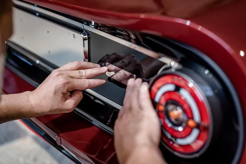 起伏に富んだボリューム感のあるデザインで、フェンダーがクラシックカーの雰囲気を醸し出しており、ベース車両の面影ははありません。ベース車両に対して全長が29cm長く、幅が5.5cm広く、全高が1cm低くなっています。ボディカラーはお客様の好みで指定が可能で、マット塗装はもちろん「ロッソ コルサ」「オプシディアン ブラック」といった固有のカラーをオーダーすることも可能です。