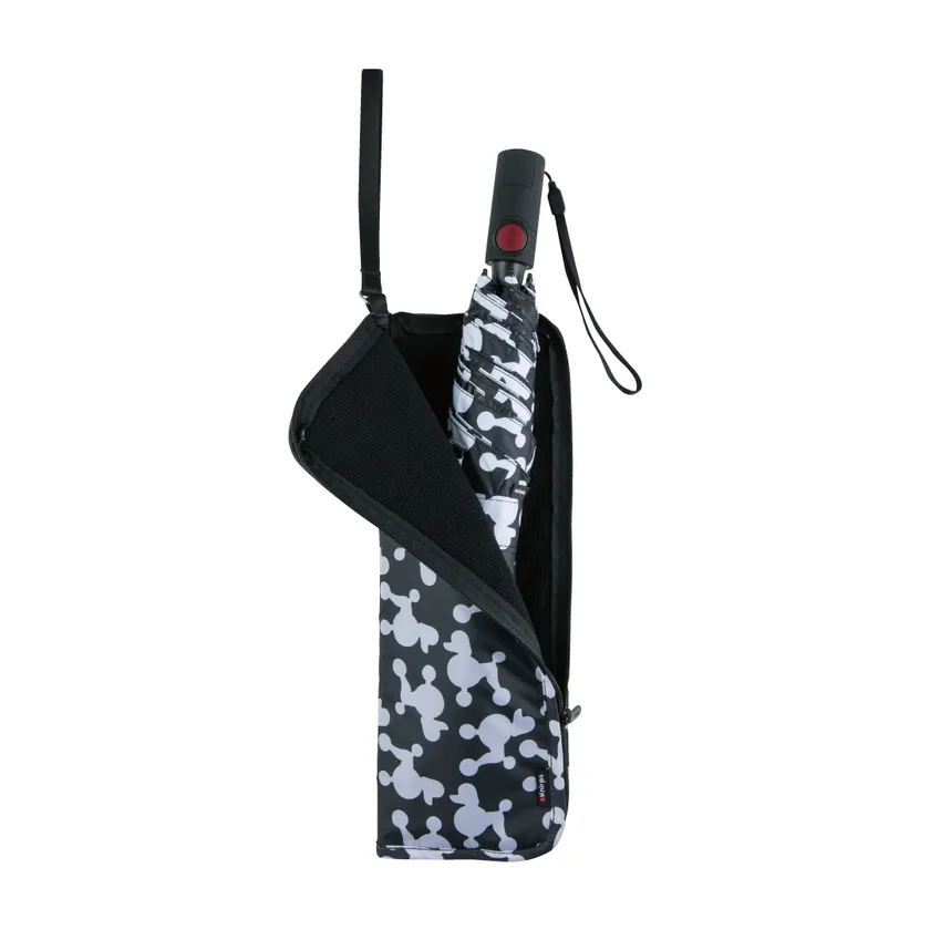 小さなバッグの時に折りたたみ傘が入らない、バッグには折りたたみ傘を入れない、という方に特におすすめです。傘生地のパターンは、プードルとお散歩気分のDrey Black(ドリー ブラック)柄を、さまざまなシーンで使いやすいモノトーンカラーに仕上げました。