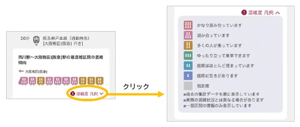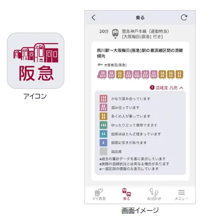 本サービスは、当社の最も混雑度の高い区間(【神戸線】神崎川→十三間、【宝塚線】三国→十三間、【京都線】上新庄→淡路間・下新庄→淡路間)の混雑状況を一定期間解析し、大阪梅田方面行きと天神橋筋六丁目方面行きの各列車・車両の同区間において予想される混雑傾向を、阪急沿線アプリおよび阪急電鉄公式ホームページを通じてお客様に提供するものです。