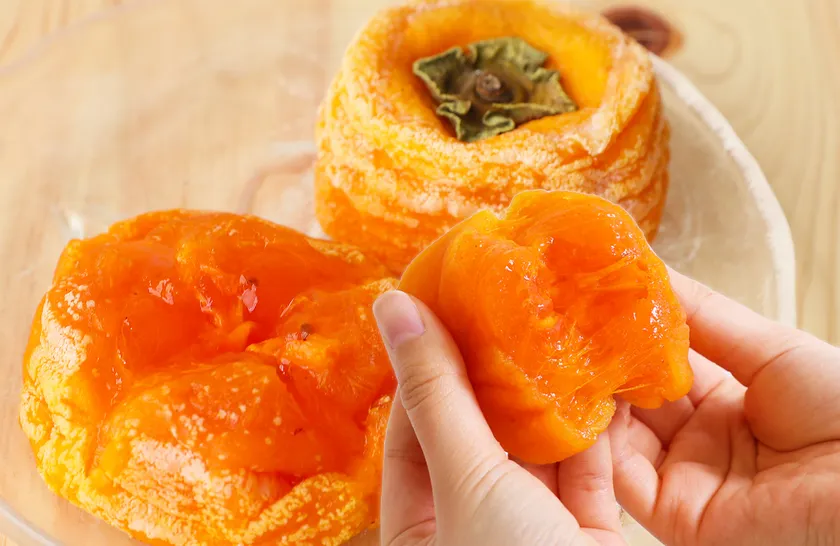 他の干し柿との決定的な違いは、この「とろ~り感」。水分量を約60%も残して仕上げたから、ふっくらほたほた優しい甘味がお口に広がります。甘くて美味しいのに、原材料は柿だけの自然菓。