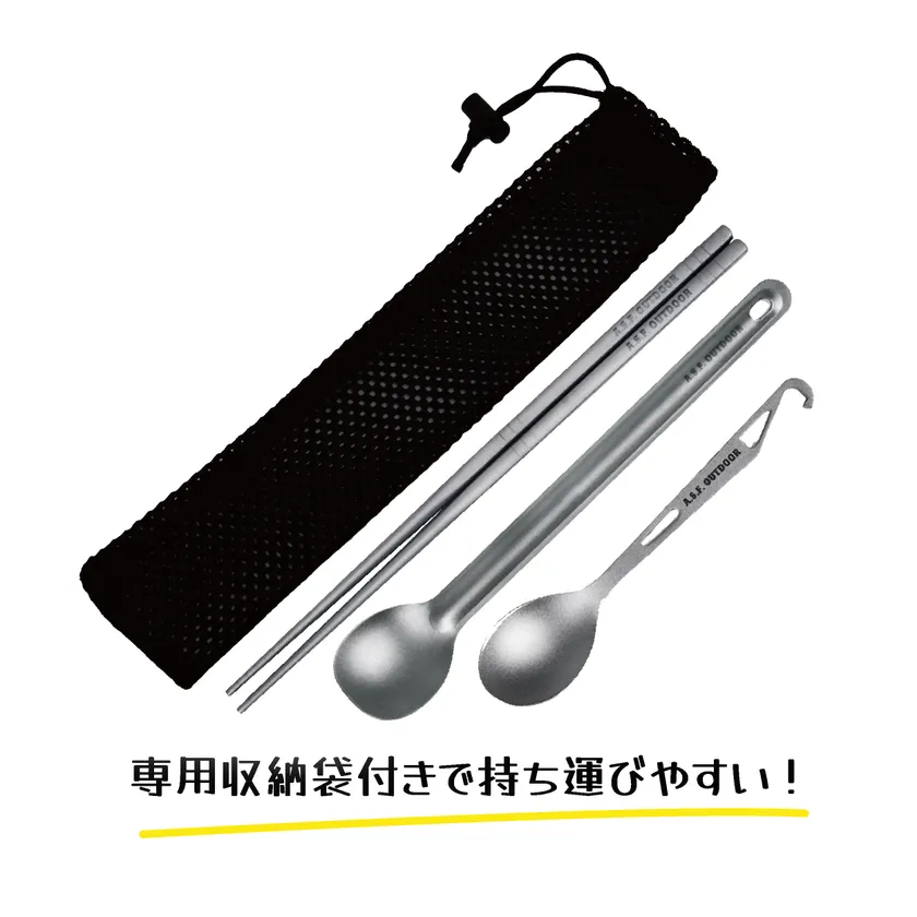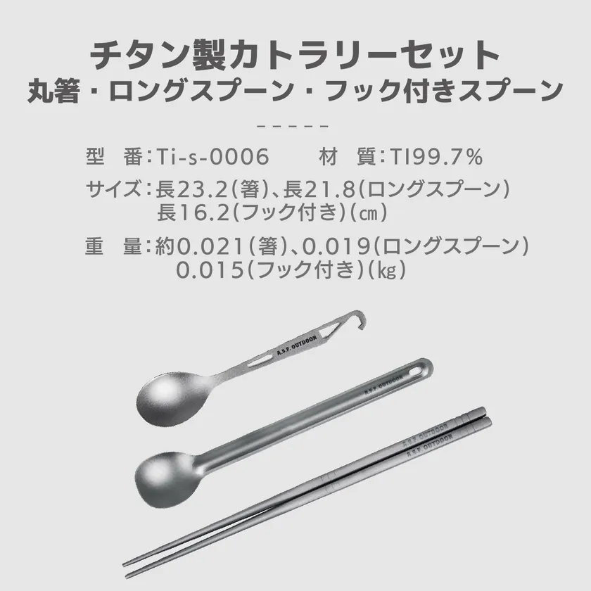 内容 : チタン製丸箸 滑り止め付き×1個、チタン製ロングスプーン×1個、