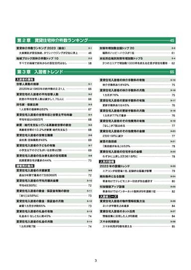 第1章では、「週刊全国賃貸住宅新聞」の名物企画である「賃貸仲介件数ランキングアンケート」を基に、不動産会社409社の仲介件数をさまざまな角度から分析しています。さらに、第3章では「賃貸住宅における人気設備アンケート」を基に入居者のニーズや傾向の変化を解説。新聞では紹介しきれなかった細かい分析も掲載しています。
