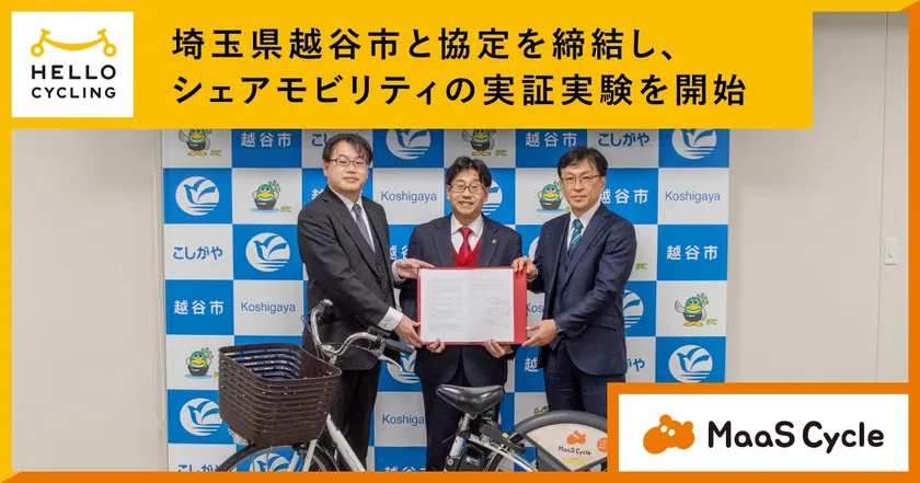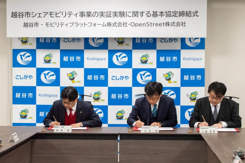 モビリティプラットフォーム株式会社(本社:埼玉県さいたま市、代表取締役社長:石井 敦、以下「モビリティプラットフォーム」)とOpenStreet株式会社(本社:東京都港区、代表取締役社長CEO:工藤 智彰、以下「OpenStreet」)は、埼玉県越谷市(市長:福田 晃)と「越谷市シェアモビリティ事業の実証実験に関する基本協定」を2024年3月26日に締結し、4月中に「HELLO CYCLING」のプラットフォームを活用した「MaaS Cycle」のシェアサイクルサービスを開始することをお知らせします。本協定に基づき、越谷市民及び来訪者の短距離移動の手段を確保し利便性を向上しつつ、新たな市の交通システムとしてのシェアモビリティの有効性を検証していきます。