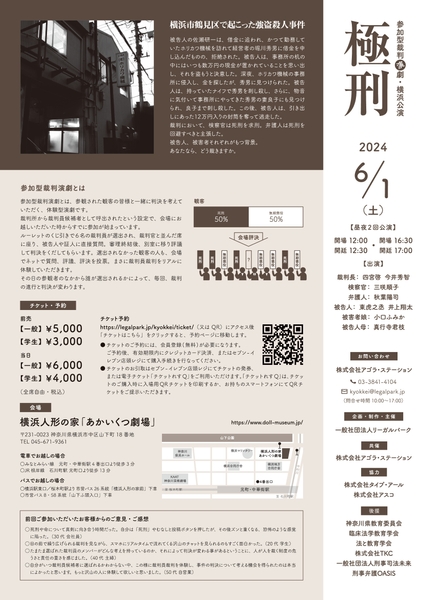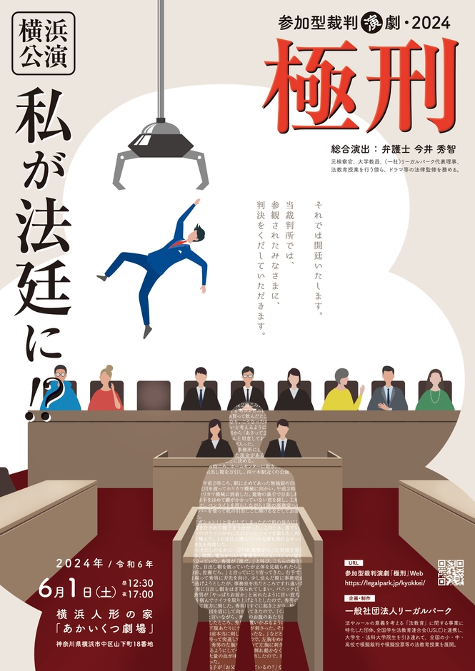 一般社団法人リーガルパーク主催の参加型裁判演劇「極刑」横浜公演が、2024年6月1日(土)に横浜 人形の家「あかいくつ劇場」にて開催されます。昨年1月と9月に東京で開催された公演の好評に伴い、初の東京以外での開催となります。11月16日(土)には、松本公演(長野県)でも開催を予定しております。