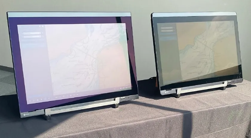 DuraVision MDF2701W(以下 MDF2701W)は、船舶に搭載する電子海図表示システム(ECDIS)やレーダー情報を表示するモニターです。船舶の操舵室は窓に面しているため、日中は太陽光の反射により画面が見えにくくなります。MDF2701Wは、液晶パネルと保護ガラスの隙間を樹脂で埋める「オプティカルボンディング加工」を施しており、光の反射による画面の映り込みを抑制し、高い視認性を実現します。