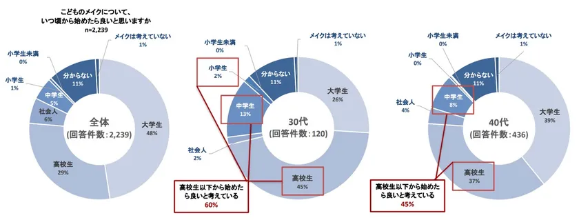 メイクを始める時期は、大学生以上が54%(「大学生」48%、「社会人」6%)、高校生以下が35%(「高校生」29%、「中学生」5%、「小学生」1%)も、30代では高校生以下が60%、40代では45%と大学生以上を上回った。