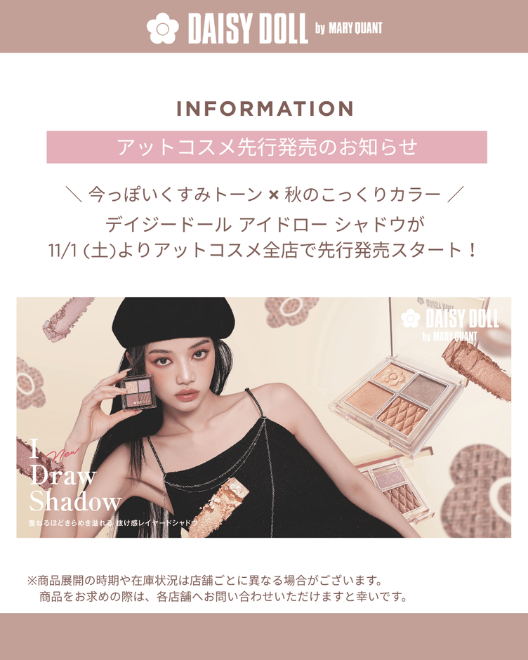 株式会社クラブコスメチックス(本社・大阪市代表取締役:中山ユカリ)が展開するコスメブランド「DAISY DOLL by MARY QUANT」は、人気アイテム『デイジードール アイ ドロー シャドウ』秋の新色を2025年11月1日(土)よりアットコスメ全店舗にて先行発売いたします。