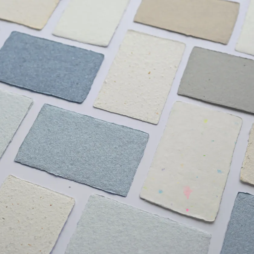 廃材が持つ質感や色味を残しながら、一枚ずつ手作業で漉き込んでいます。「廃材」と「手漉き」が織りなす唯一無二の風合いが受け取った相手の興味を惹き付け、商品コンセプトや企業の考え方などを顧客・取引先に伝えるきっかけを生み出します。