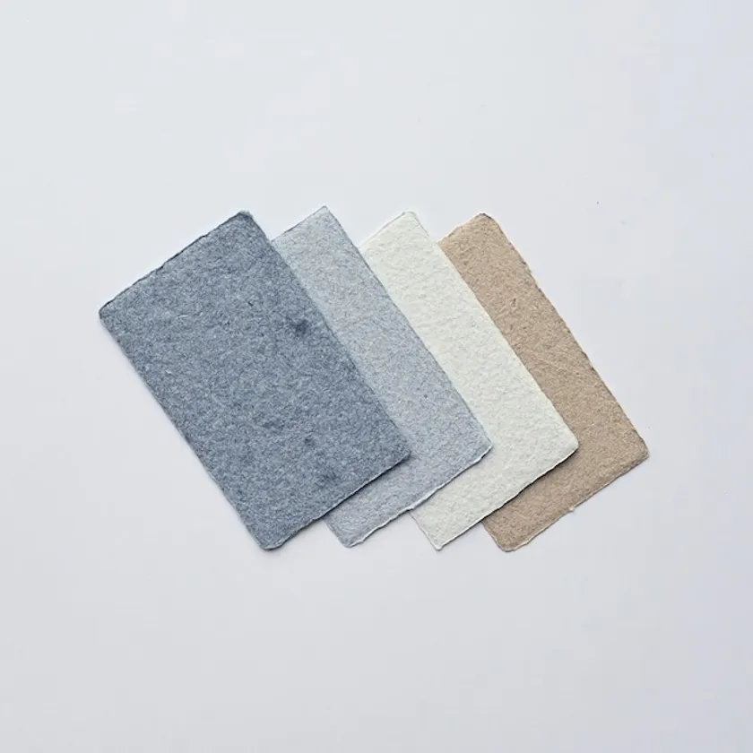 デニム、家具、味噌、醤油、古新聞、コーヒー、折り鶴など、さまざまなジャンルの廃材をアップサイクルした全11種類の再生紙をご用意。業種や商品コンセプト、企業メッセージに適した商品をお選びいただけます。サイズや厚みの調整に関するご相談にも応じます。また、紙の卸も承っています。