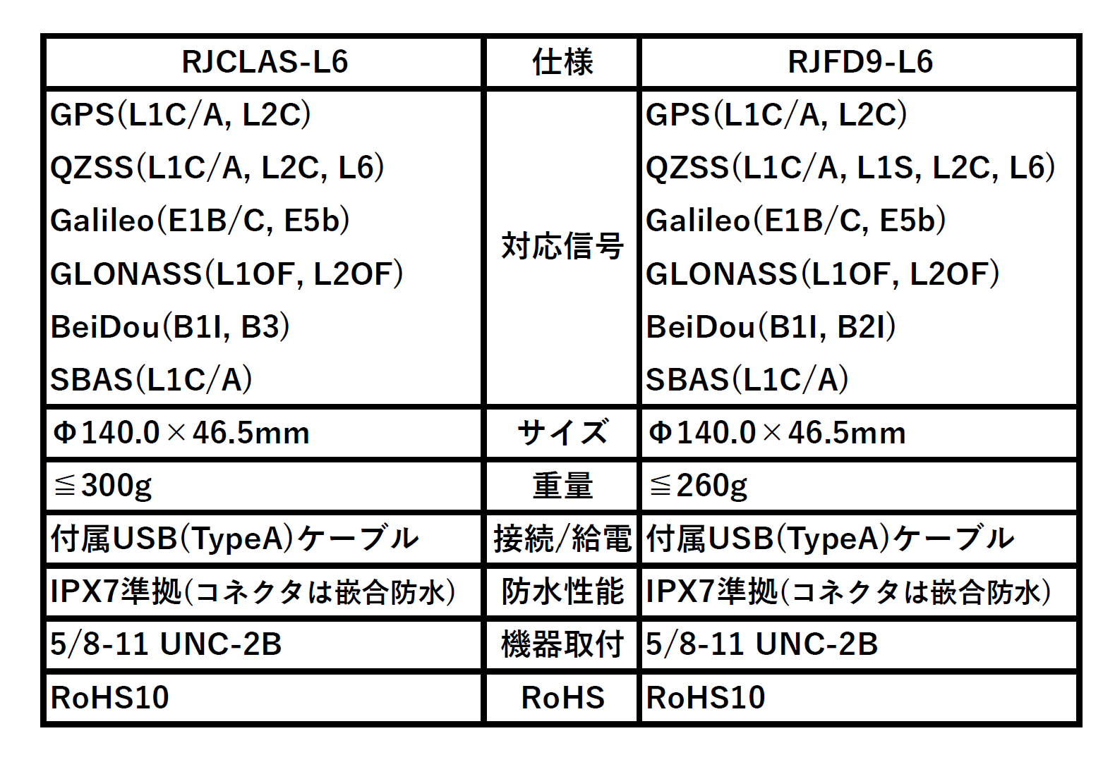 「RJシリーズ」は、受信チップとアンテナ一体型のGNSSユニットで、付属のUSBケーブルでPCに接続し、簡単に各アプリでデータを確認することができます。すでにL1,L2の2周波対応の「RJF9P2」をご利用いただいておりますが、このたびL6信号も受信可能な2つの機種「RJCLAS-L6」「RJFD9-L6」を開発いたしました。