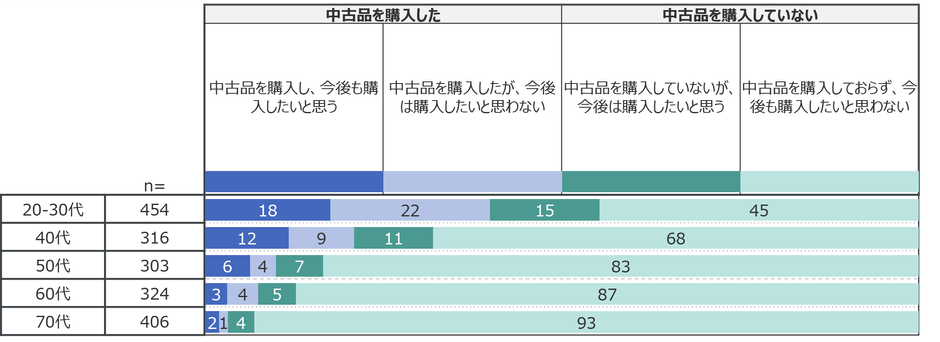 2023年にゴルフラウンドを行ったラウンド経験者に対しては、中古品の購入実態と今後の購入意向を更に紐解くため、年代別で特徴が見られるかを調査した。