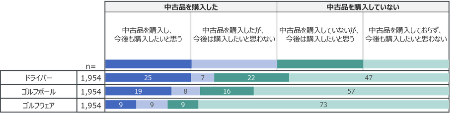 ドライバー・ゴルフボール・ゴルフウェアの3品目間で調査結果を比較したところ、2023年のドライバーの中古品購入率は3割以上と最も高い結果となった。この結果から、他の品目と比較して中古市場が受け皿として市場を支えていることが分かる。また、「中古品を購入していないが、今後は購入したいと思う」と回答した割合も2割以上となっており、ドライバー購入時の選択肢として中古品も検討する購買行動があることが伺える。