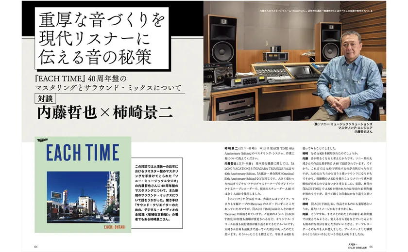 本書の監修者でもある音楽評論家・湯浅学と『EACH TIME』のストリングス・アレンジを担当した井上鑑の試聴対談は、弊誌ならではの読みどころ満載の企画です。この試聴対談では井上鑑が大滝詠一とのコラボレーションを通じて学んできたこと、アレンジャーとしての取り組みなどを語り尽くしています。歴代のCDを振り返りながら、40周年盤の目玉というべき5.1chサラウンド・ミックスの魅力にもクローズアップしています。