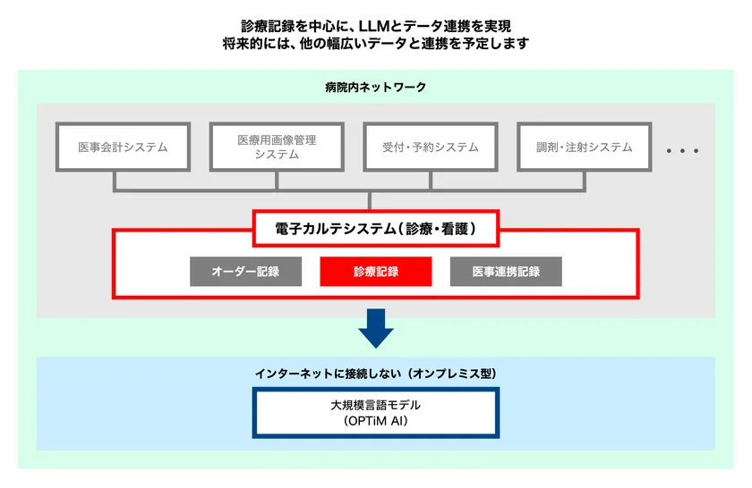 本プロジェクトは、このような背景を受け、外部ネットワークへの接続を必要としない「OPTiM AI」を導入しました。電子カルテと連携し、臨床現場にオンプレミスでLLMが導入されたのは国内初となります。