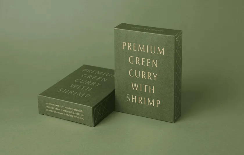 頑張った自分へのご褒美にもお召し上がりいただきたいとの想いから、パッケージにもこだわっています。落ち着いた緑色の化粧箱には箔押しを施し、高級感のあるデザインに仕上げました。ギフト箱にも収まるサイズですので、エスニック料理がお好きな方やグリーンカレーがお好きな方への贈り物にもおすすめです。