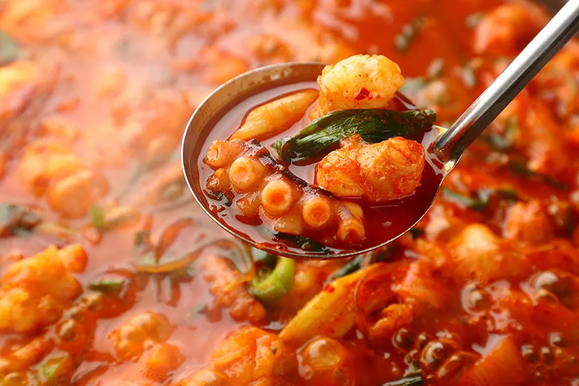 韓国釜山(プサン)の名物で、タコ・海老・牛ホルモンを使い、旨辛の特製ソースで煮込んだ韓国海鮮鍋料理です。