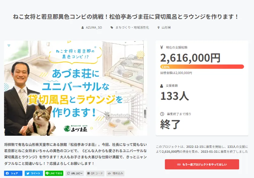 また、松伯亭あづま荘では、ねこ女将をモチーフにしたグッズを販売したり、館内に猫の装飾を施したり、ねこ女将に支えられて厳しい時期も乗り越えてきました。しかし、引退宣言を受け、「ねこ女将に頼り続けるのではなく、自立した持続可能な旅館でいられるように、今回のプロジェクトの成功をもって自信をつけたい」と決意を込めたクラウドファンディングとなっております。