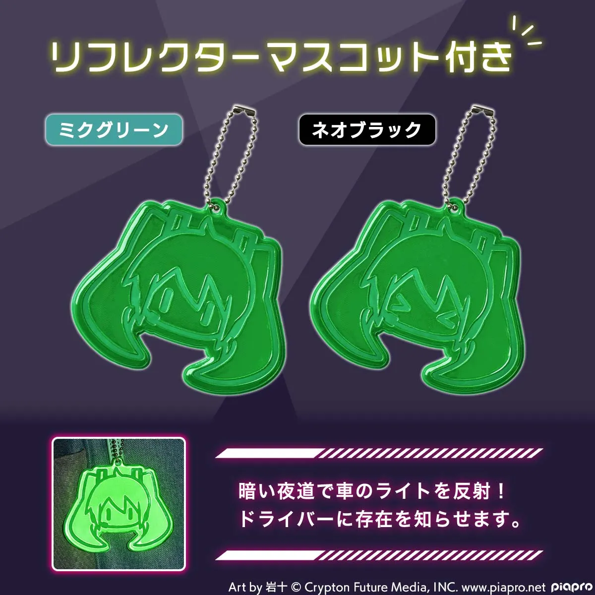 岩十さん描き下ろしの愛らしいミクフェイスが、暗い夜道で車や街灯の光を反射します。