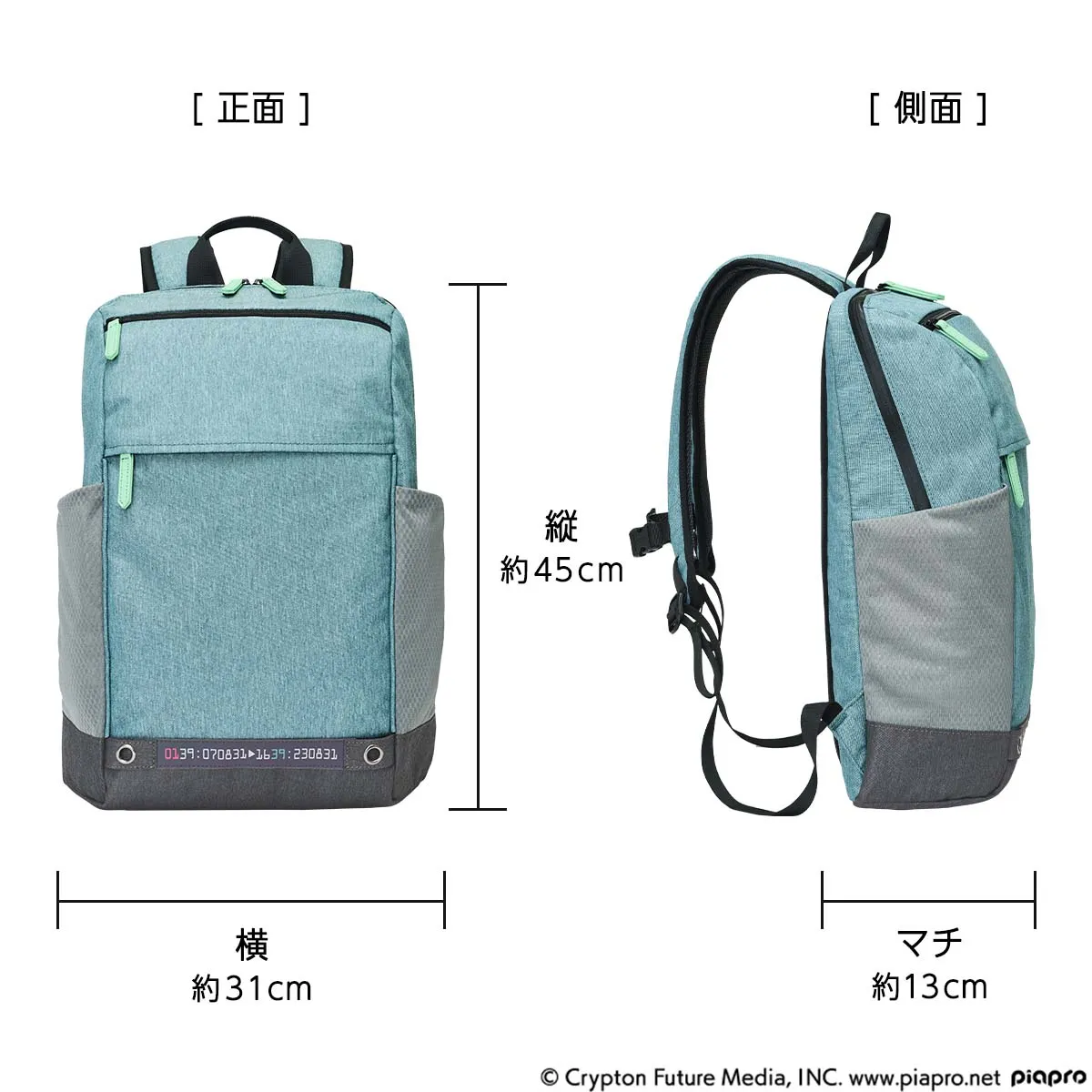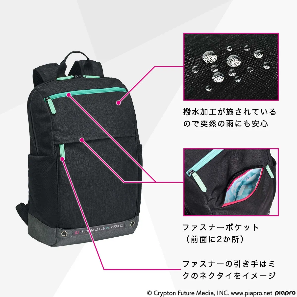 前面には出し入れの多い小物を入れるのに最適な2つのファスナーポケットを装備。ファスナーの引き手の形状&カラーはミクのネクタイをイメージ。表地には撥水加工が施されているので雨の日にも安心です。