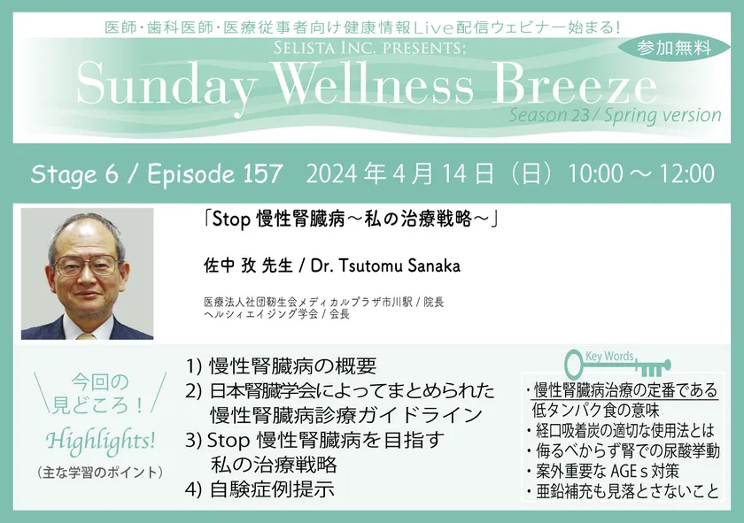 セリスタ株式会社(東京都千代田区 代表取締役 伊藤 承正)は、2024年4月14日(日)に、佐中 孜先生(医療法人社団靭生会メディカルプラザ市川駅 / 院長)を講師にお迎えし、医師・歯科医師などの医療従事者向け無料Zoomオンラインセミナー『Stop慢性腎臓病~私の治療戦略~』を開催します。