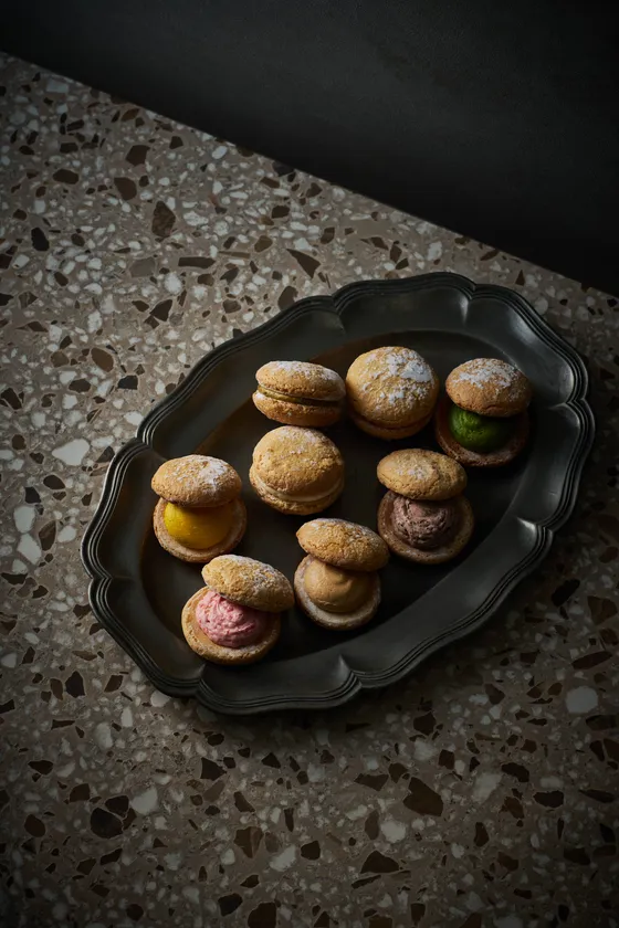 ブラッドオレンジ(愛媛県産)とピスタチオ(シチリア島ブロンテ産)/あまおういちご(福岡県産)とバニラ(マダガスカル産)/王林りんご(青森県産)とアールグレイ/不知火みかん(熊本県産)とプラリネ/安納芋(鹿児島県産)とカルバドス/紫いも(鹿児島県産)とカシス