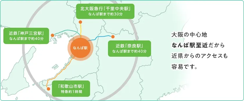 アクセス: 南海電鉄「南海なんば駅」直結、御堂筋線「なんば駅」南改札より7分